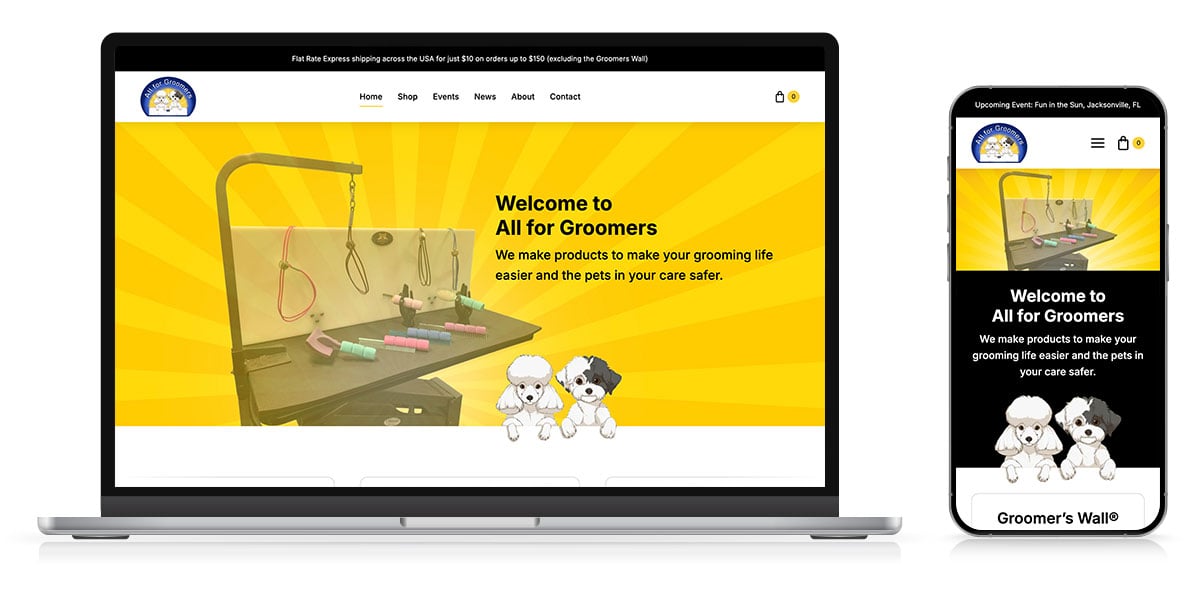 All for Groomers develops innovative products for the professional pet grooming industry—tools and solutions designed by groomers, for groomers. Needing some help with an upgrade, they turned to our team for a fresh rebuild that would restore function, improve the shopping experience, and better reflect the quality of their brand.